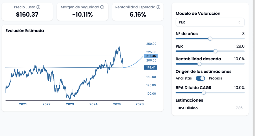 Como empresa madura que es, el crecimiento está bajando, por lo que un PER de 60 ya no me parece factible. Con un crecimiento <10% se aproximará más a un Per 25 que un 60, como la media histórica.
