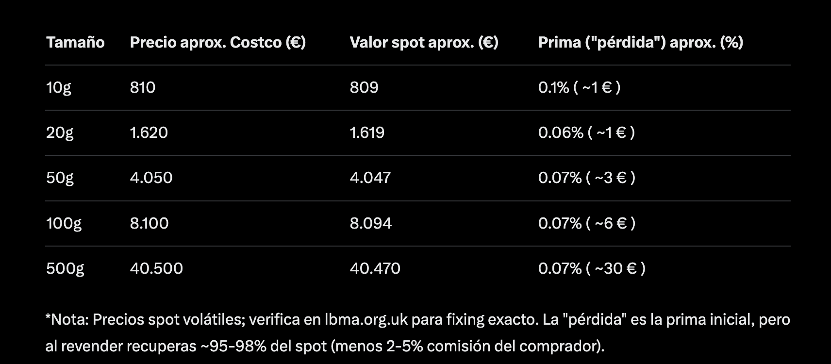 Igual es una pregunta absurda pero algun@ esta al tanto de que tal la experiencia de comprar oro u otros metales preciosos en costco? Spread/comisión, si permiten pago en efectivo a menos de 1000e…he leído que esta bien pero no conozco a nadie que lo haya hecho o que lo haya visto de primera mano