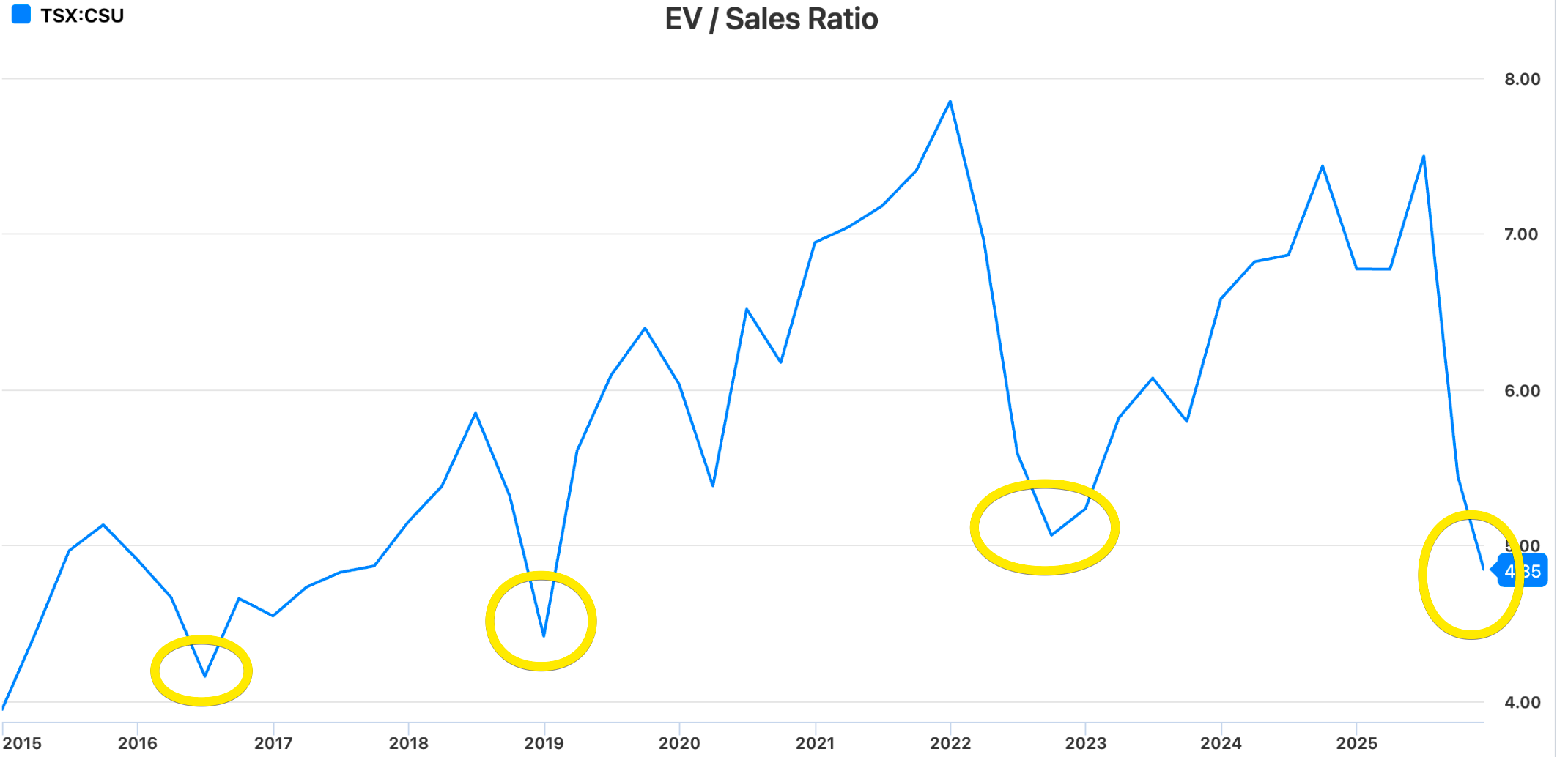 Actualmente y hablo de cabeza el ev/ebidta anda sobre 15 (NTM) es el más bajo o de los más bajos en 10 años, más atrás podemos encontrar valoraciones inferiores pero claro el mercado era más barato y csu más desconocida