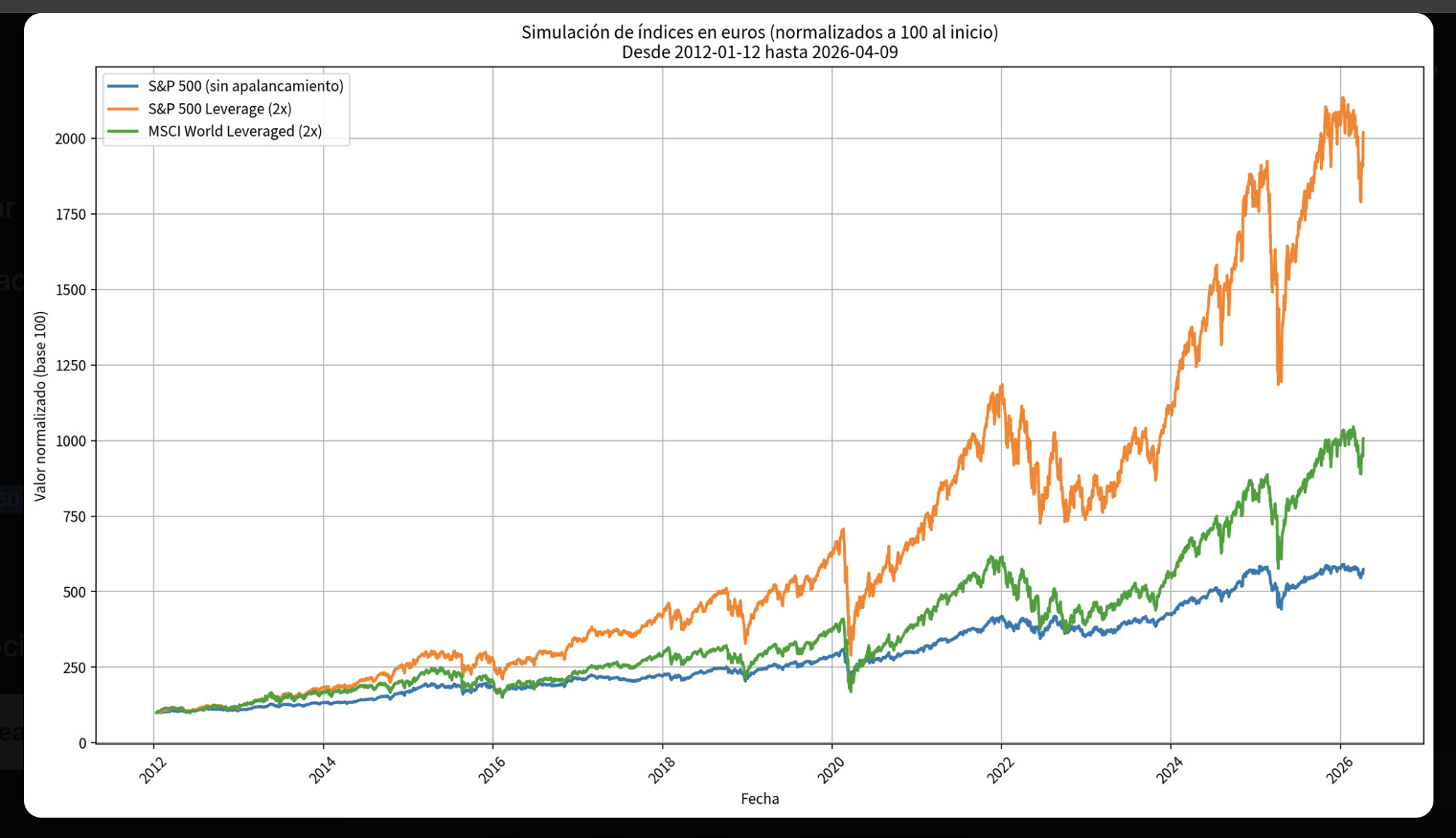 Datos del índice MSCI World 2× vs 1× (2014–2025):
