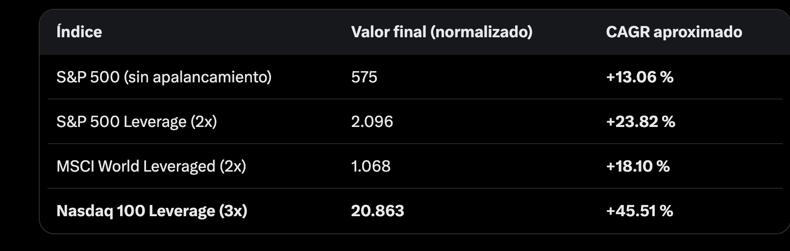 Observa algo clave: el 3× no triplica rentabilidad, porque la volatilidad destruye rendimiento.