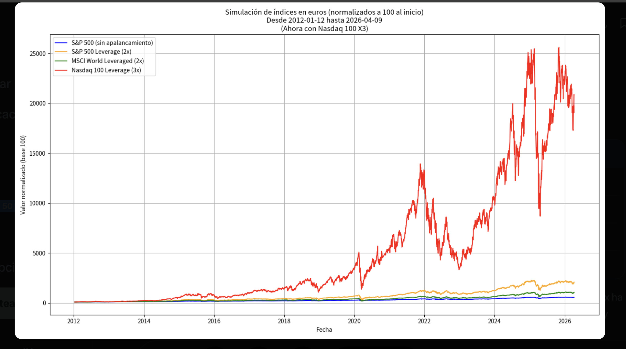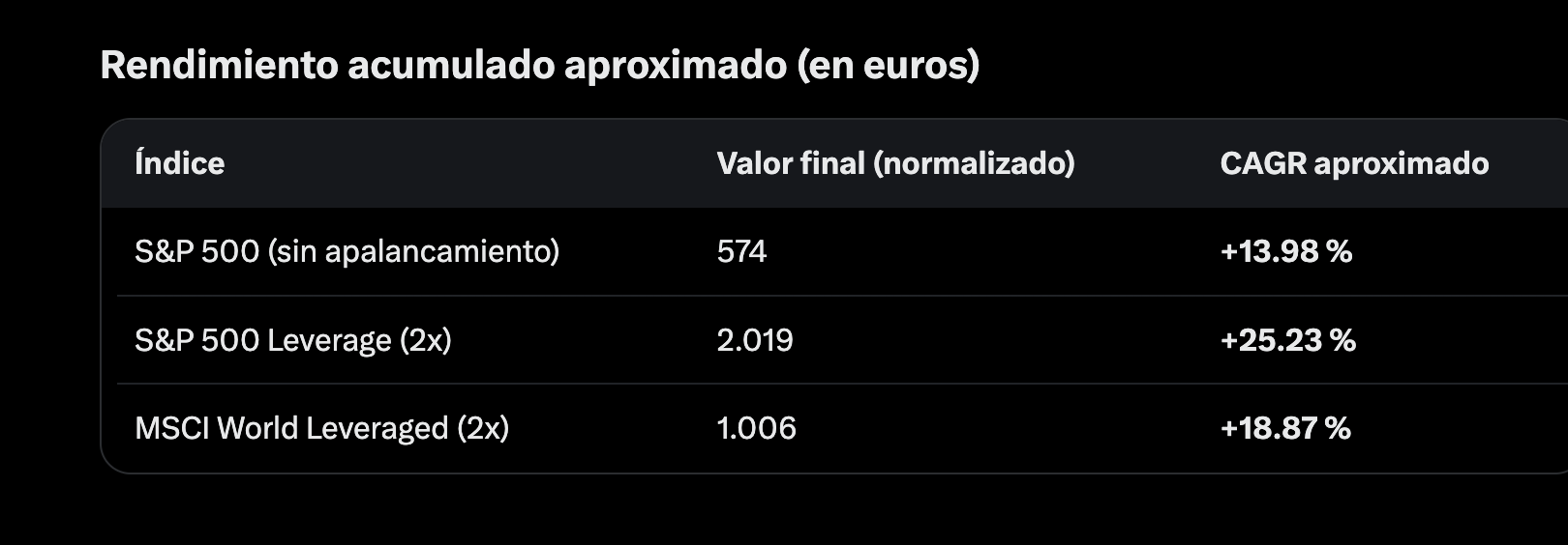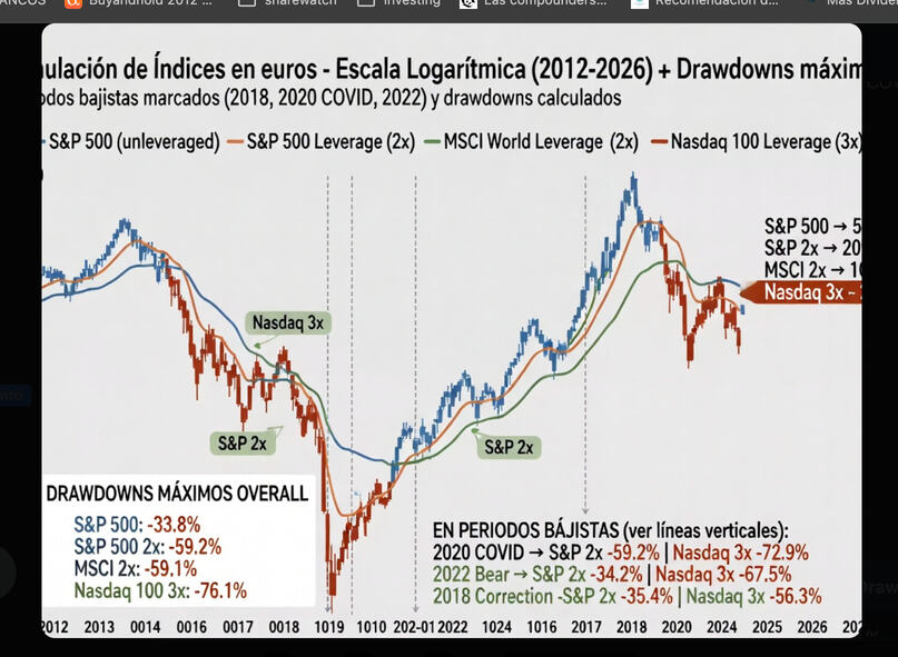 Importante: no existe un MSCI World 3× puro muy popular en Europa, pero el comportamiento es extrapolable desde ETFs 3× sobre índices amplios (S&P 500, Nasdaq). El efecto matemático es el mismo.