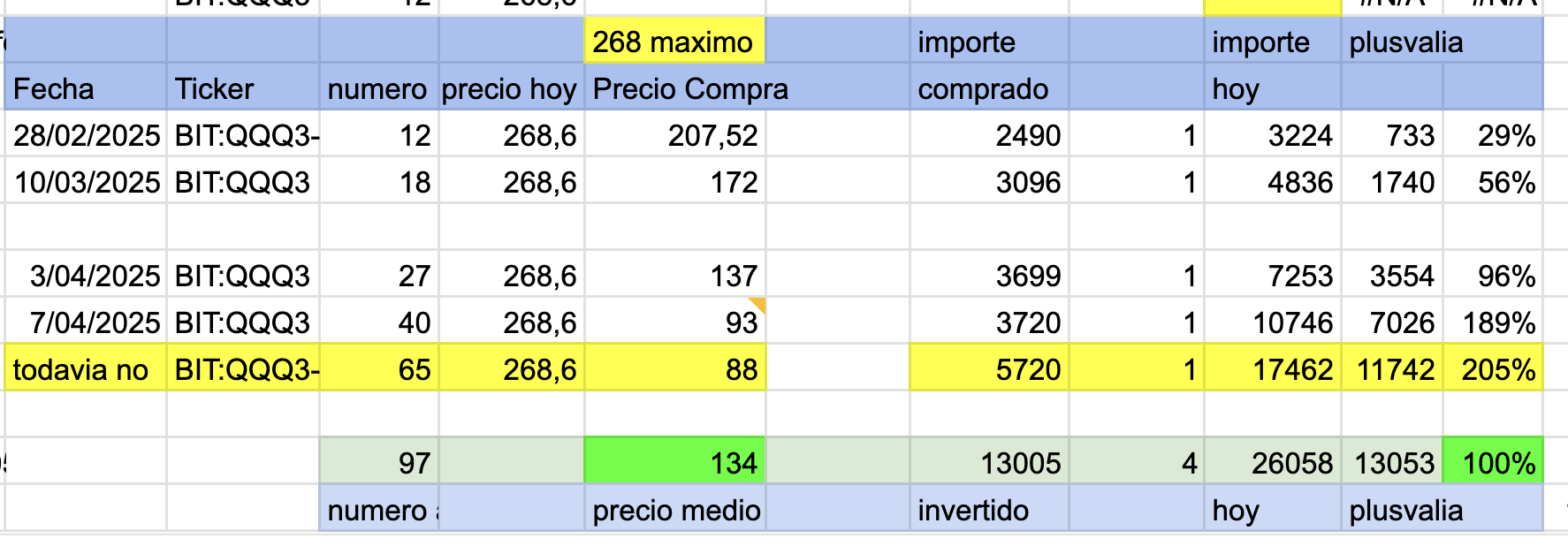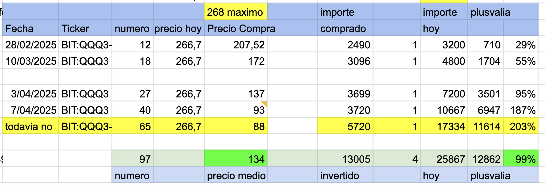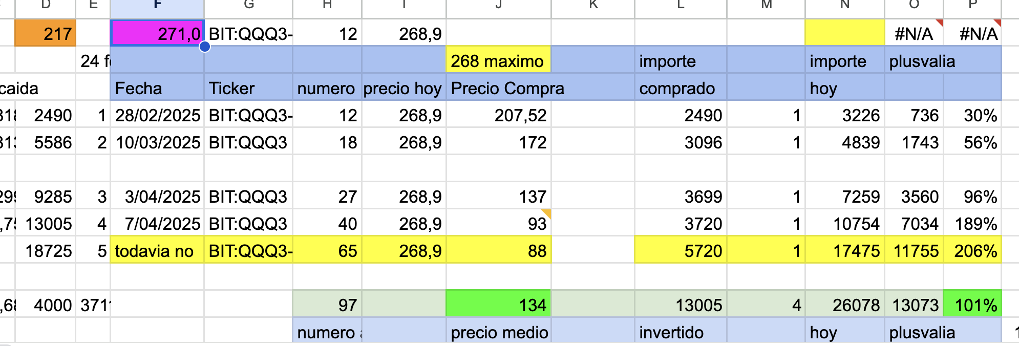 En morado ,maximo con la formula =GOOGLEFINANCE(G26;“high”). Siendo G26,BIT:QQQ3-ETFP. Hoy esta en 271.